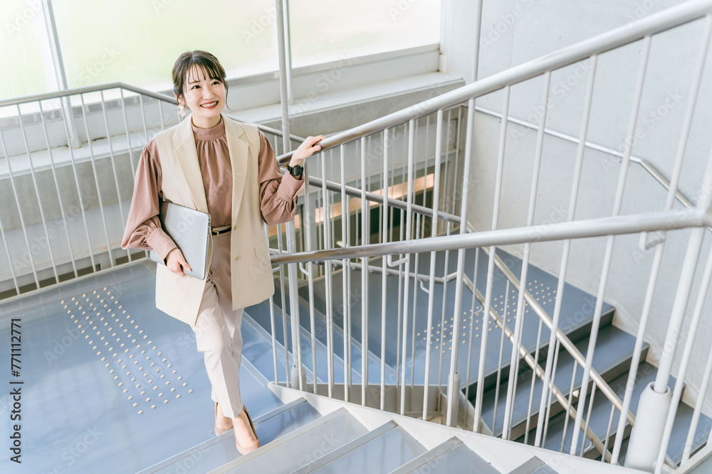 オフィスの階段を登る女性・ビジネスウーマン(朝・出社・出勤・ダイエット・日常活動)