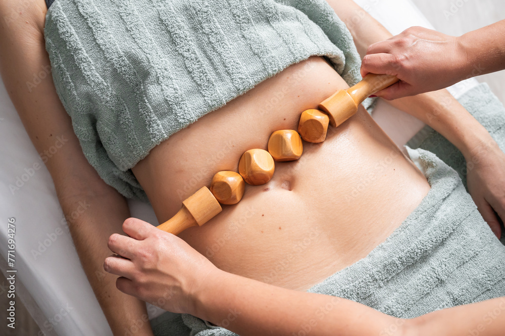 professional masseuse applying a new treatment with the Colombian maderoterpaia kit to a patient