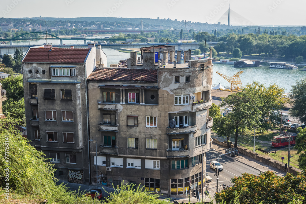 View from Kalemegdan Park in Belgrade with Sava river bank and Old Sava Bridge, Serbia