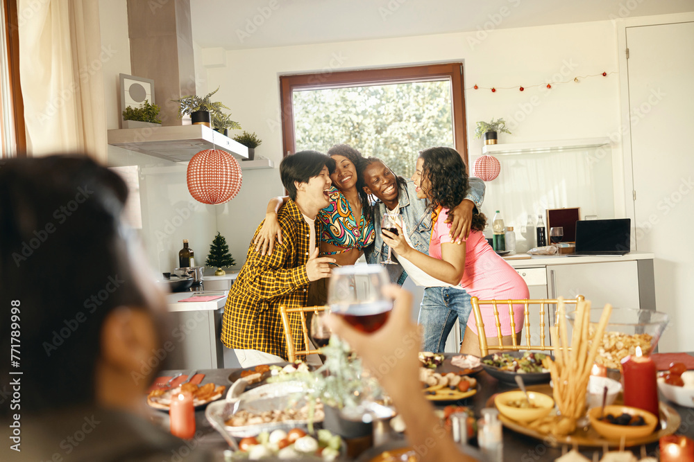 Cheerful young group of diverse friends holding drinks and hugging at home kitchen during party time