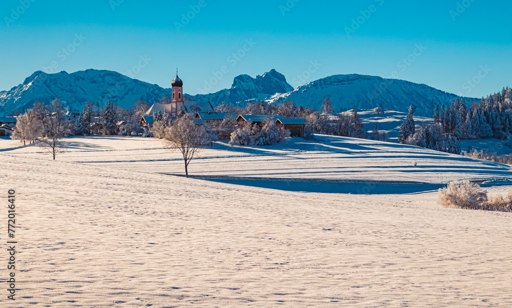 Alpine winter wonderland view with a church near Seeg, Ostallgaeu, Bavaria, Germany