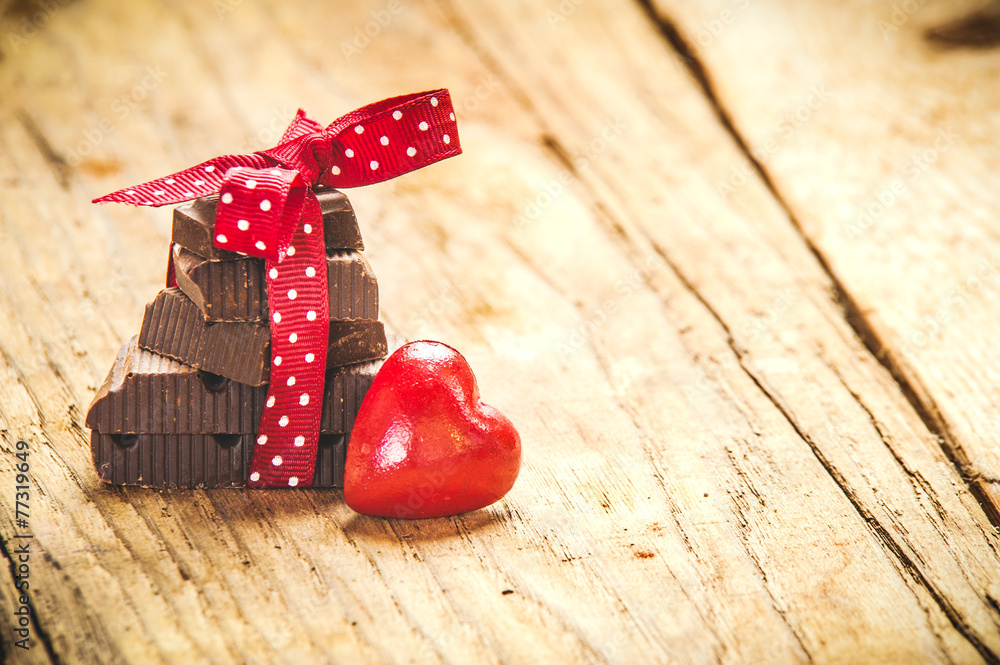Chocolate with ribbon and heart on St. Valentine's day love.