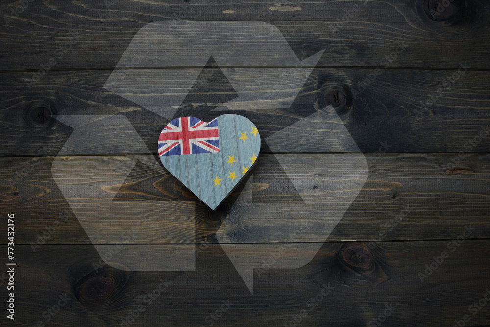 wooden heart with national flag of Tuvalu near reduce, reuse and recycle sing on the wooden background. concept