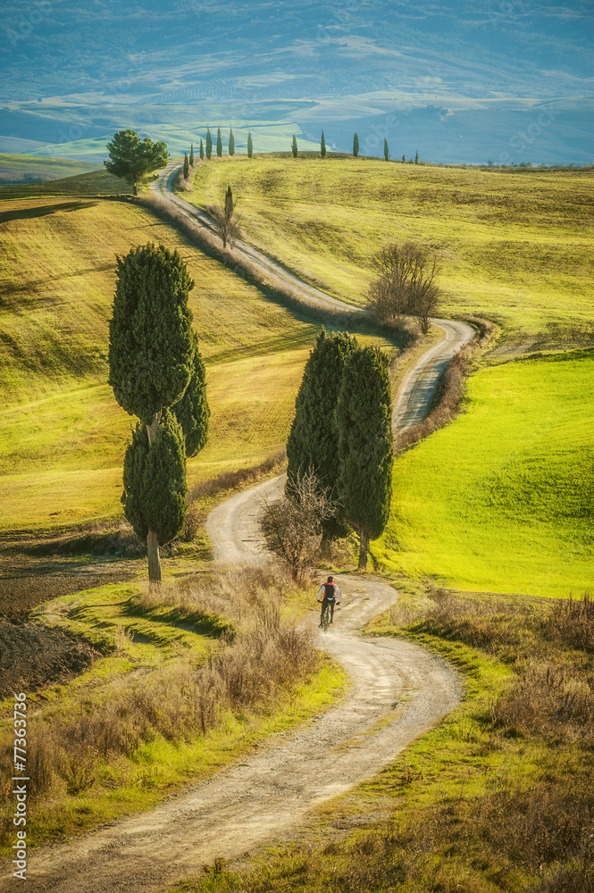 Cypress trees on the road to a farmhouse in the Tuscan landscape