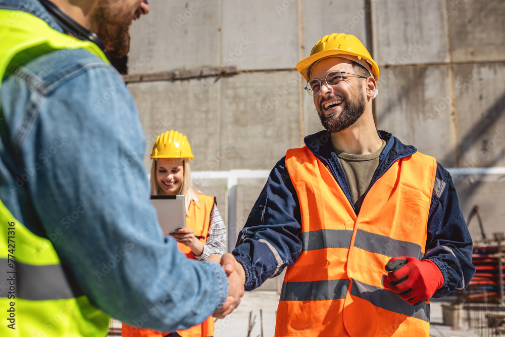 Contractor. construction worker team hands shaking after plan project contract at construction site, contractor, engineering, partnership, construction concept