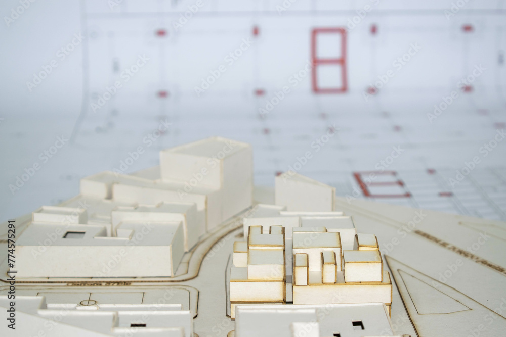 Architectural model made of white strawboard with architectural, technical and constructive background plans