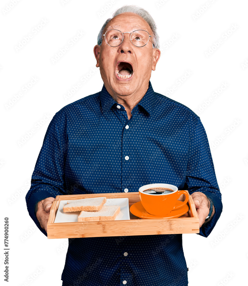 Senior man with grey hair holding tray with lunch and coffee angry and mad screaming frustrated and furious, shouting with anger looking up.