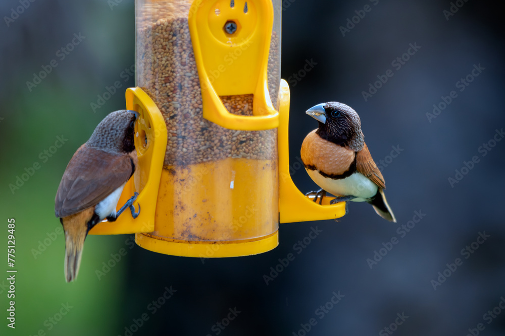 The chestnut-breasted mannikin (Lonchura castaneothorax) is seen at a bid-feeder in Paea on Tahiti in French Polynesia. The bird is also known as a chestnut-breasted munia or bully bird.