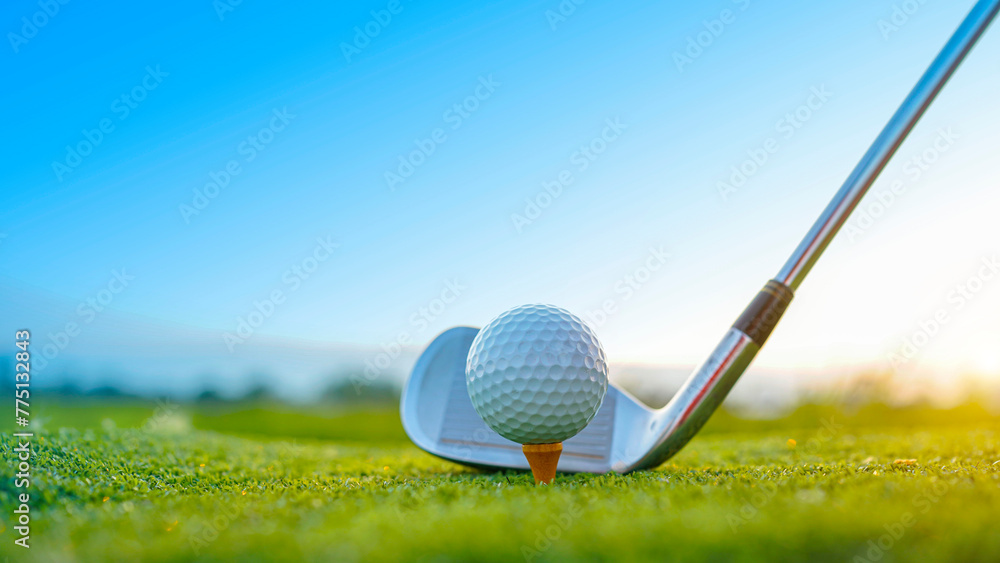 Golf clubs and golf balls on a green lawn in a beautiful golf course with morning sunshine.