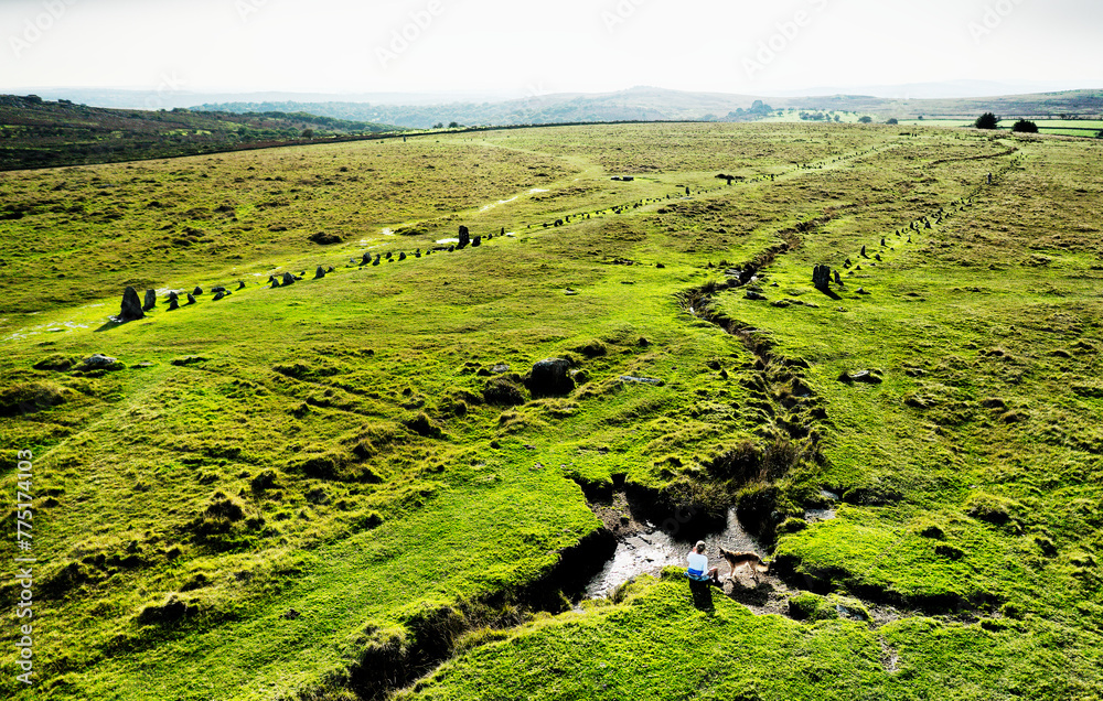 Merrivale stone rows. Prehistoric late Neolithic 3000 – 2300 BC site on Dartmoor, Devon, England. The two double stone row avenues. Aerial to S.W.
