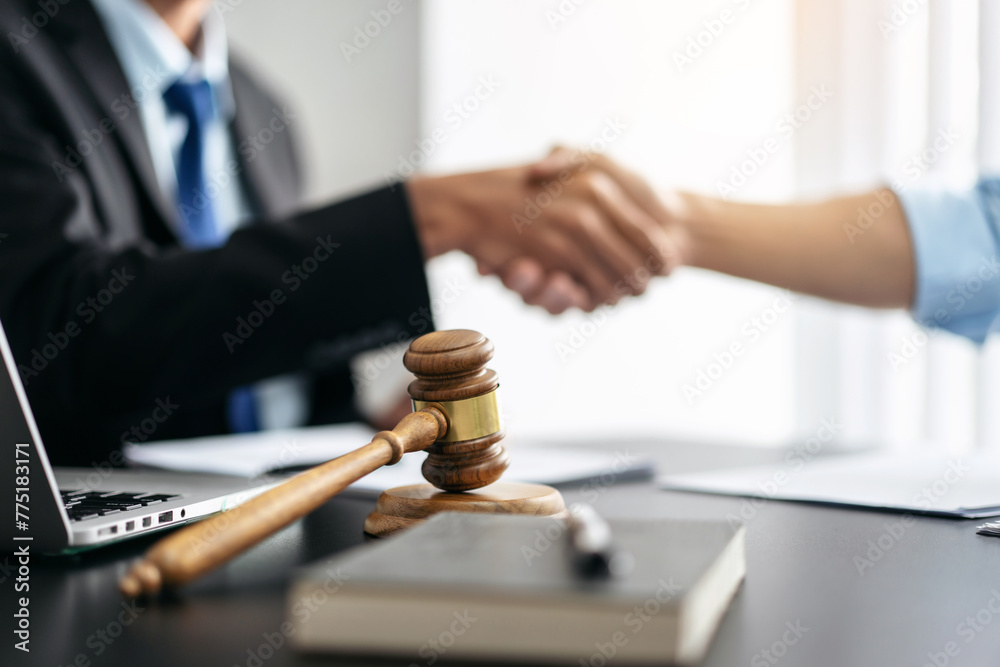 Handshake after good cooperation, Two people shaking hands after discussing contract agreement on front a judge's gavel