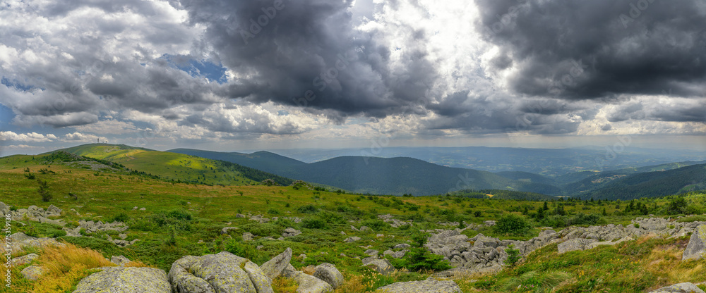 Panorama des collines du col du Béal dans le Livradois-Forez en Auvergne par temps orageux l'été