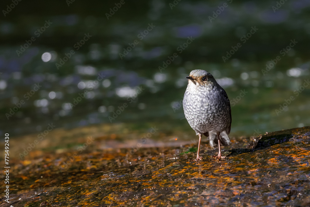 Plumbeous Redstart Yellow-brown face There are white spots on the underside of the neck. The chest and belly are gray with white scale patterns.