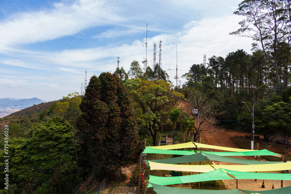 Campo de Antenas na Serra de São Domingos - POÇOS DE CALDAS, MG, BRAZIL - JULY 19, 2023: View of the antenna field with its telecommunications towers in Serra de São Domingos.