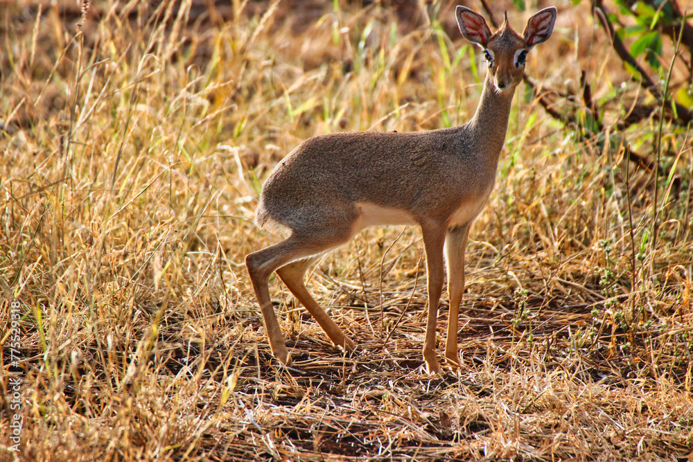 A petite Dikdik antelope in the evening sun at the Buffalo Springs Reserve in Samburu County, Kenya
