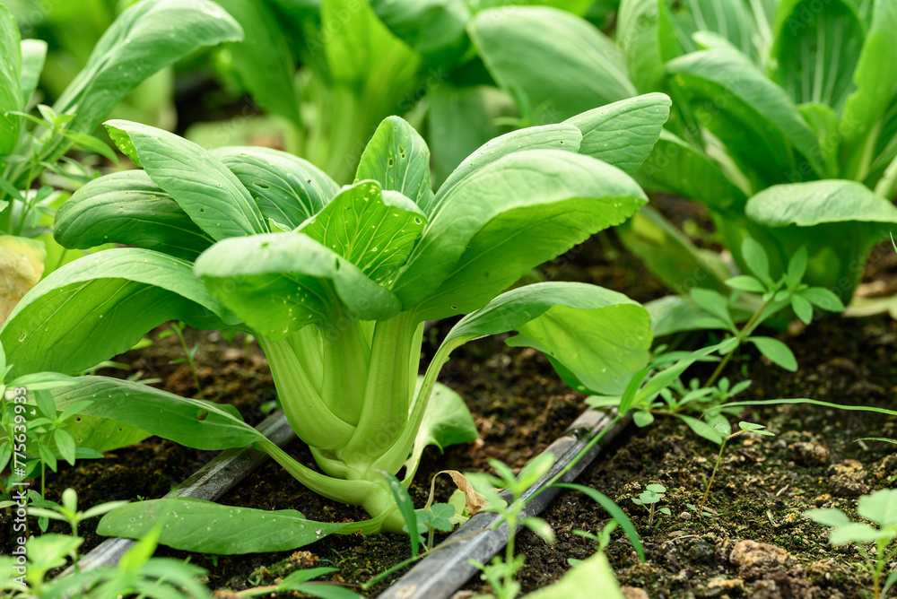 Bok choy plant growing in organic vegetable garden using drip Irrigation system