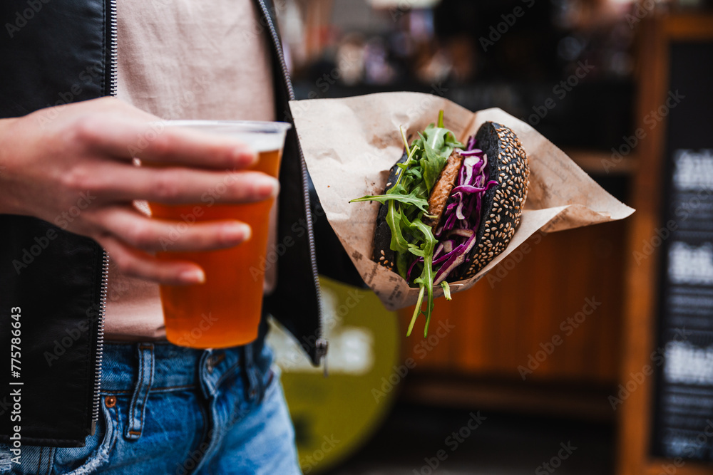 Close up of woman hands holding delicious organic salmon vegetarian burger and homebrewed IPA beer on open air beer an burger urban street food festival in Ljubljana, Slovenia