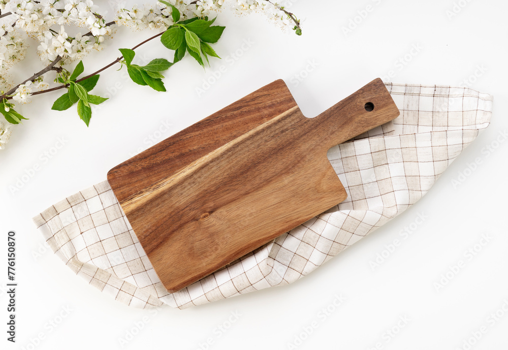 Kitchen wooden cutting board top view, serving dish empty space design, tableware on white.