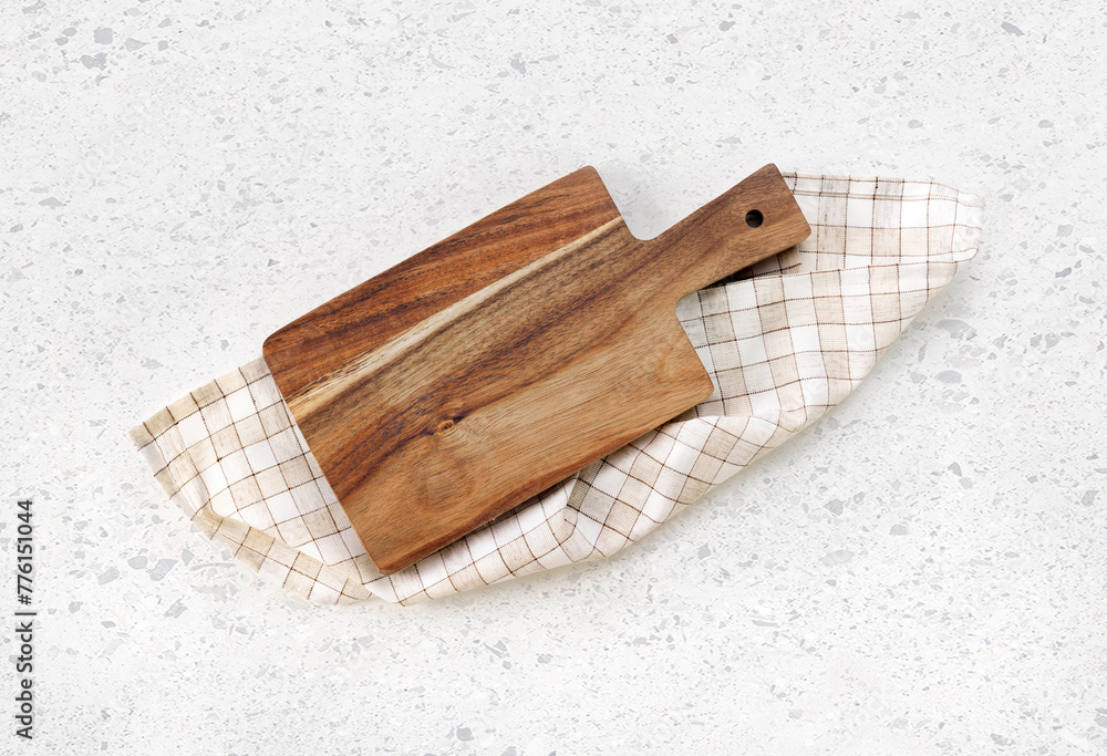 Cutting board top view, kitchen wooden tray decorated with checkered folded cloth on white table.Food backdrop.