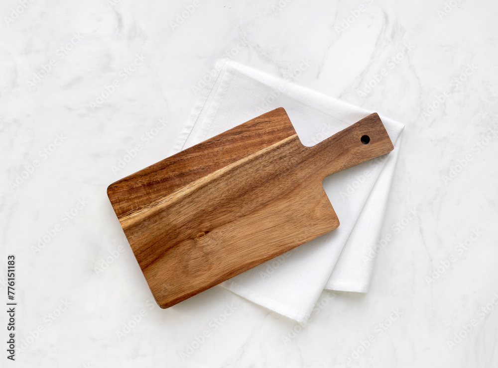 Cutting board top view, kitchen wooden tray decorated with towel cloth on white table.Food backdrop.