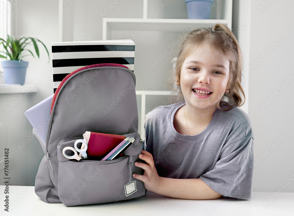 Caucasian child girl portrait with backpack.Back to school concept,school supplies.