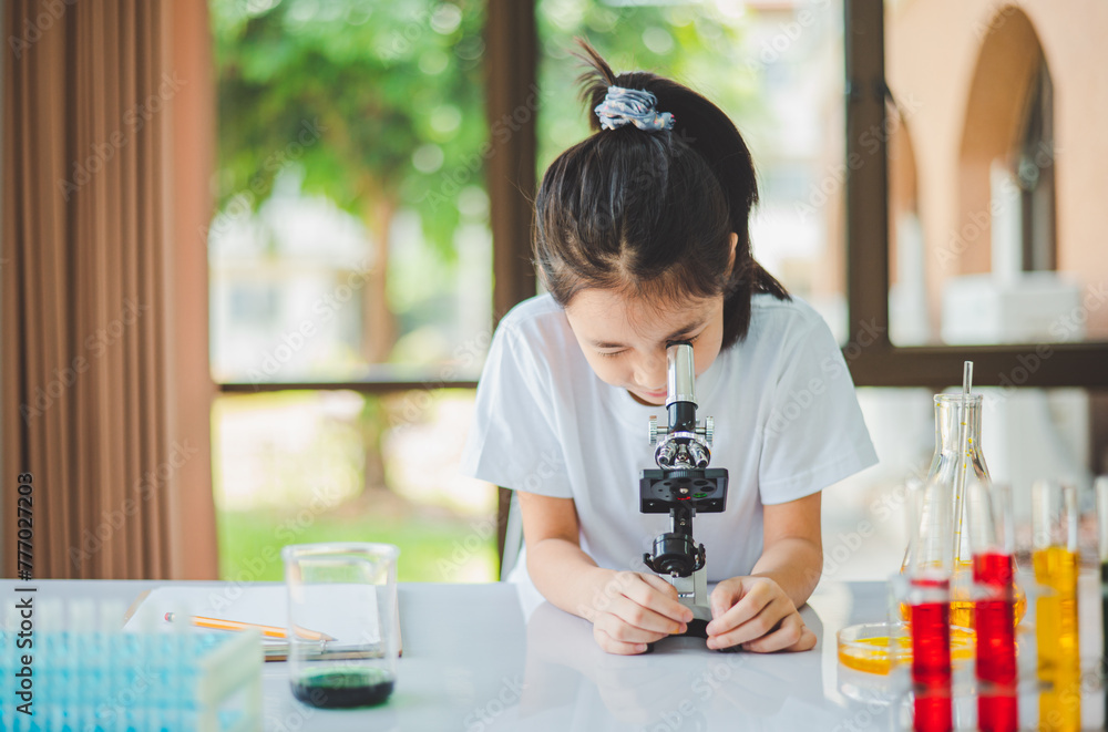 little scientist looking through a microscope and test tubes filled with chemicals for learning about science and experiments.