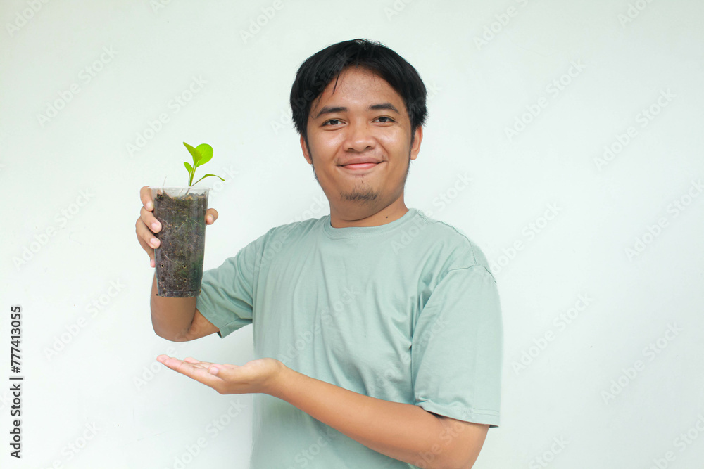 A young Asian man holds a vegetable plant pot made from used plastic bottles with an happy expression and showing gesture. Isolated in gray background.