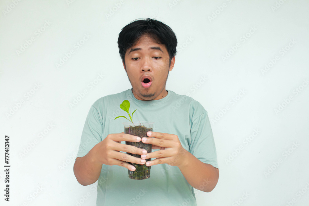 A young Asian man holds a vegetable plant pot made from used plastic bottles with an amazed expression. Isolated in gray background.
