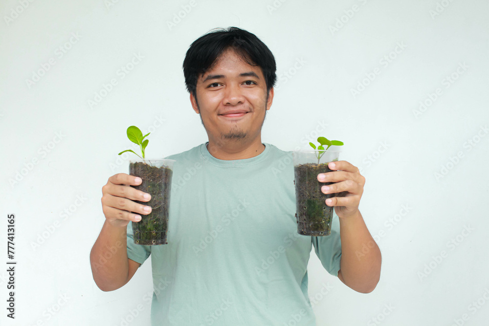 A young Asian man holds a vegetable plant pot made from used plastic bottles with an happy expression. Isolated in gray background.