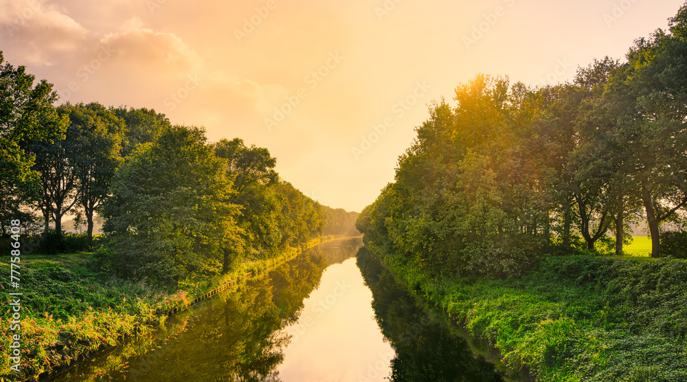 Sunset lighting slightly foggy canal "Wilhelminakanaal" near the village of Aarle-Rixtel, The Netherlands.