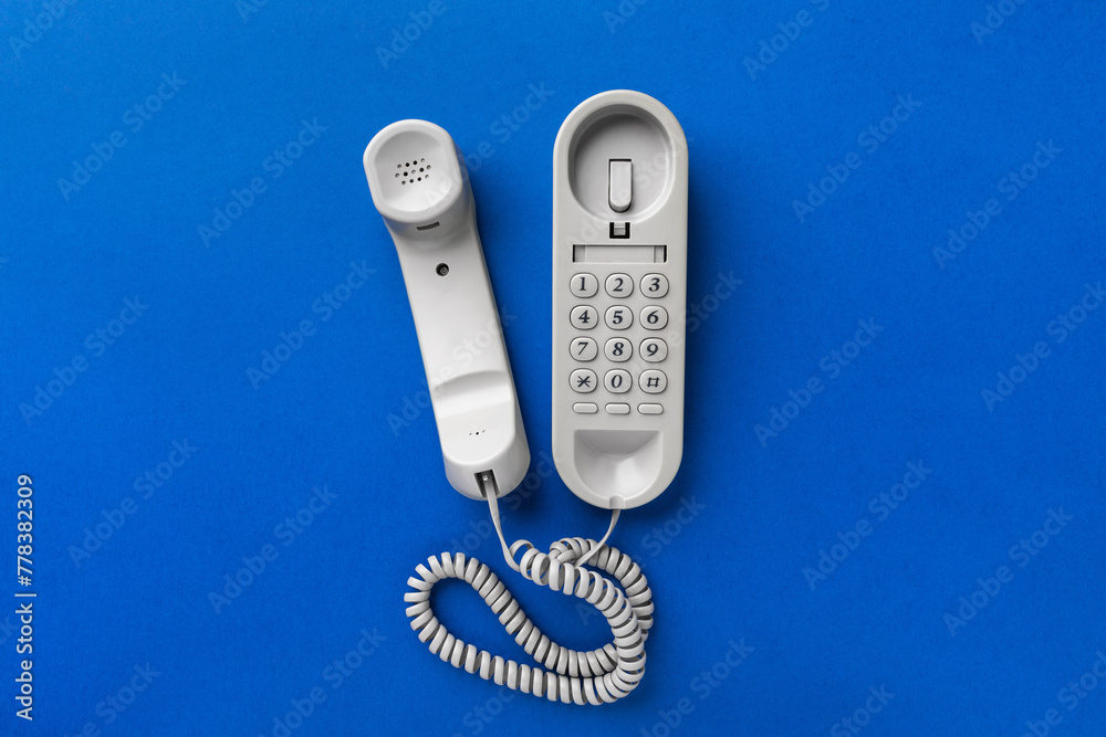 Old corded telephone on a blue background, top view
