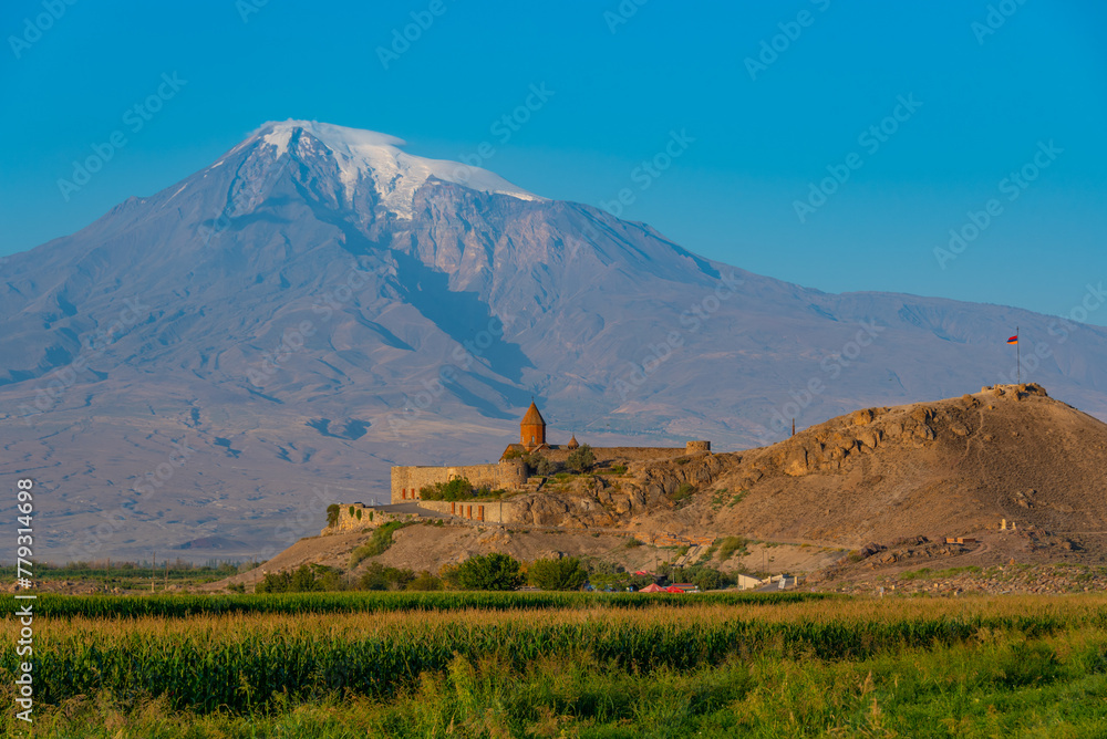 Sunrise view of Khor Virap Monastery standing in front of Ararat moutain in Armenia