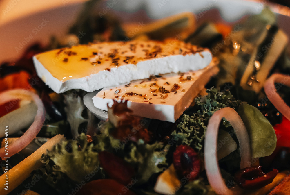 Macro details of healthy vegetable salad with a large piece of cheese, olive oil onion and spices.