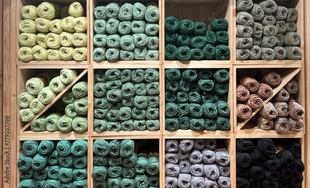 Hobby and knitting concepts. Multi-colored balls of wool on square shelves