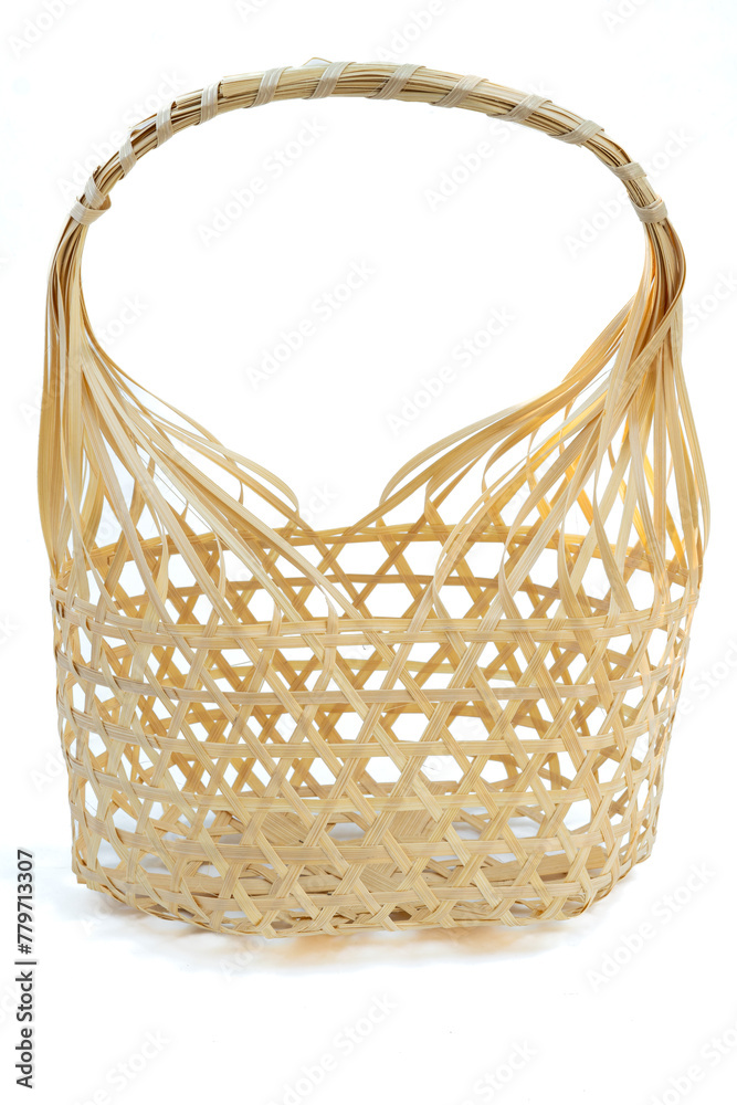 Chalom or round bamboo basket is a natural basketry using bamboo that is weaved together to form a basket for use in holding various things. Bamboo basket on a white cardboard background.