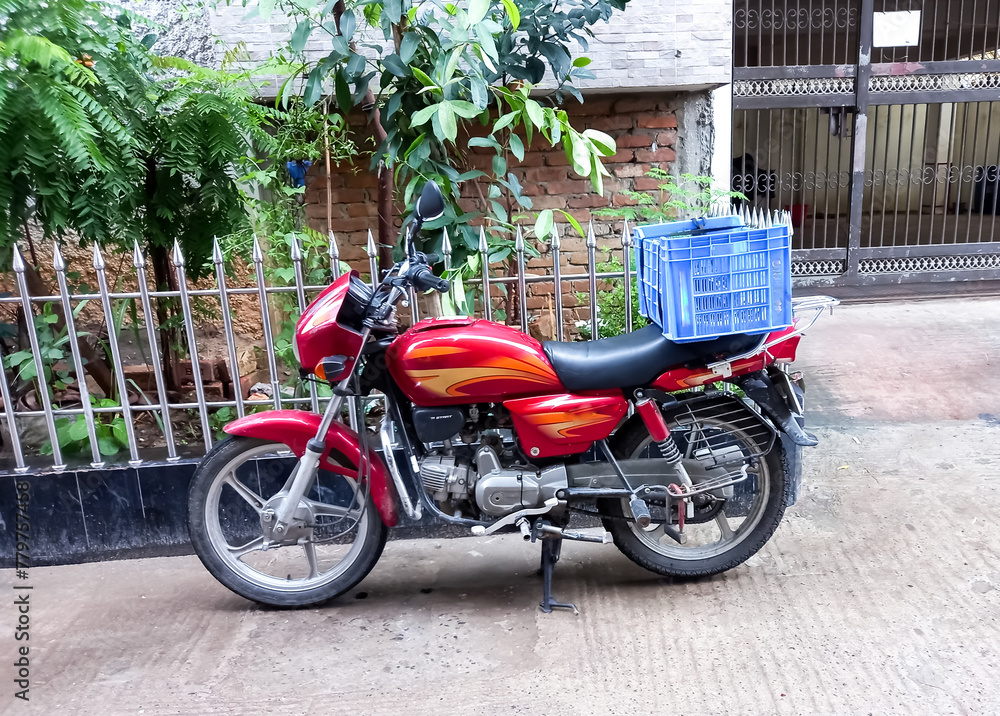 Standing bike use delivering products in Bangladesh on residential area. Any product delivery application concept. Dhaka, Bangladesh.