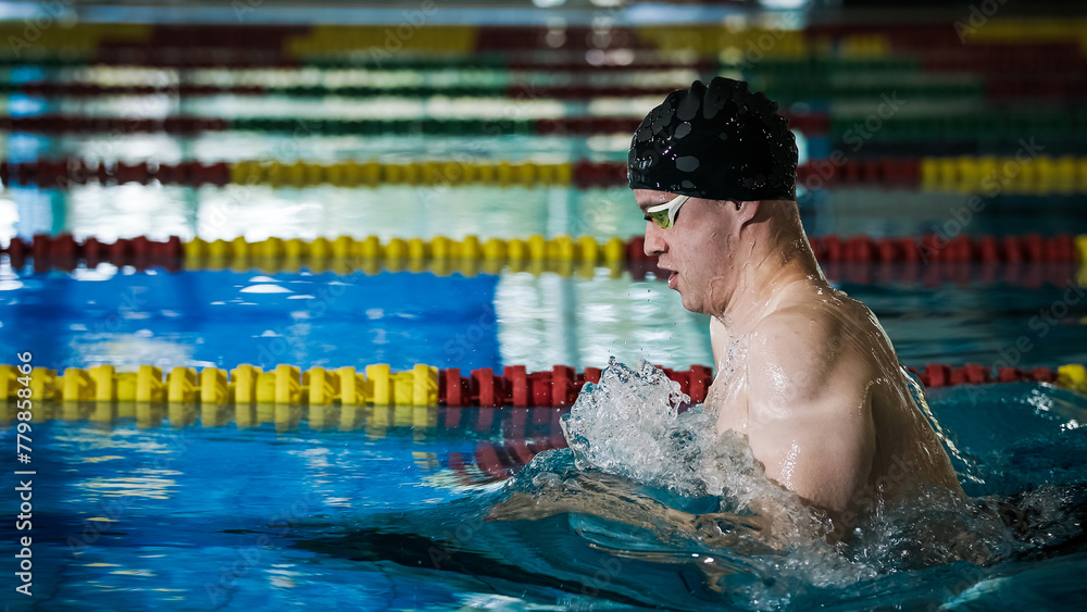 Male athlete swimming in breaststroke style in the pool, stroke, immerse, and lift out of the water to breathe.