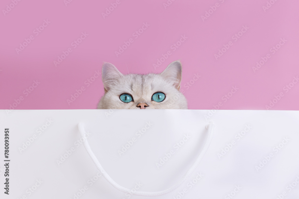 Head of cute white cat, with big blue eyes peeking out of white paper bag