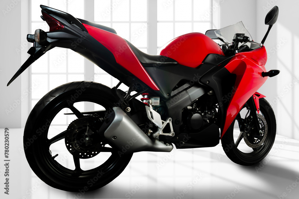 full rear body view of red sports type motorbike with fuel injection system, 250 cc engine,
