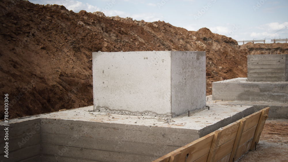 Monolithic reinforced concrete foundations for the construction of a large building. Grillage at the construction site. Construction pit with foundation. close-up View from above