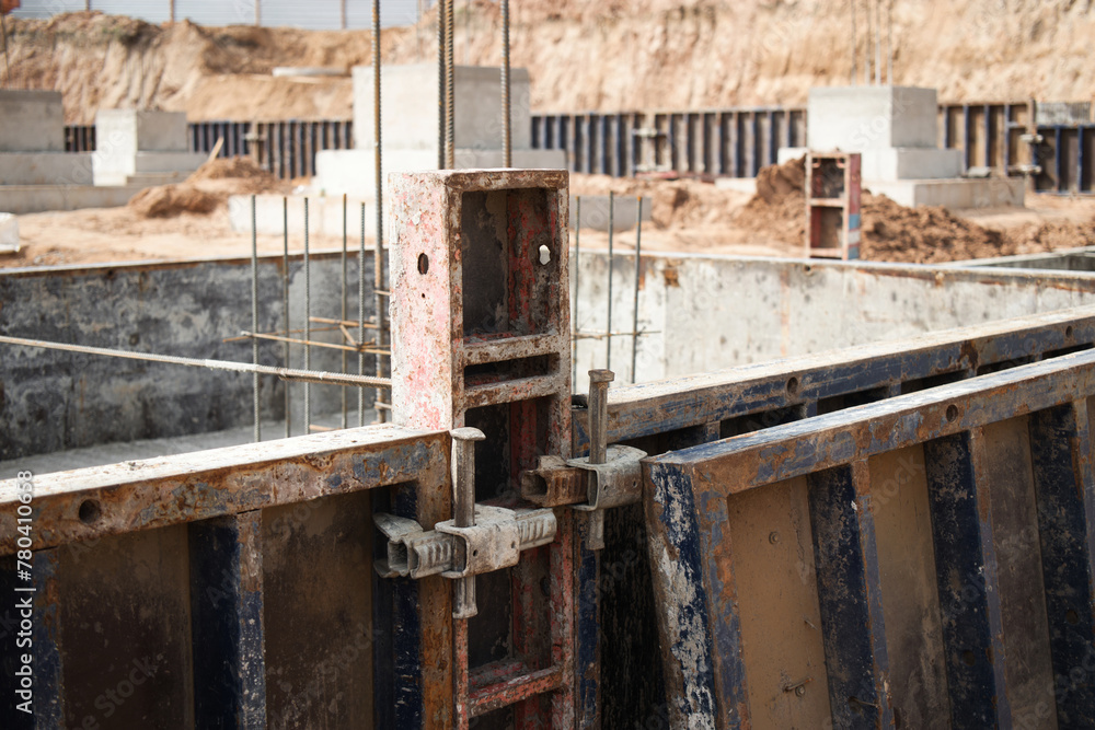 Reinforced concrete foundations support a bustling construction site filled with a variety of pipes as workers install essential infrastructure