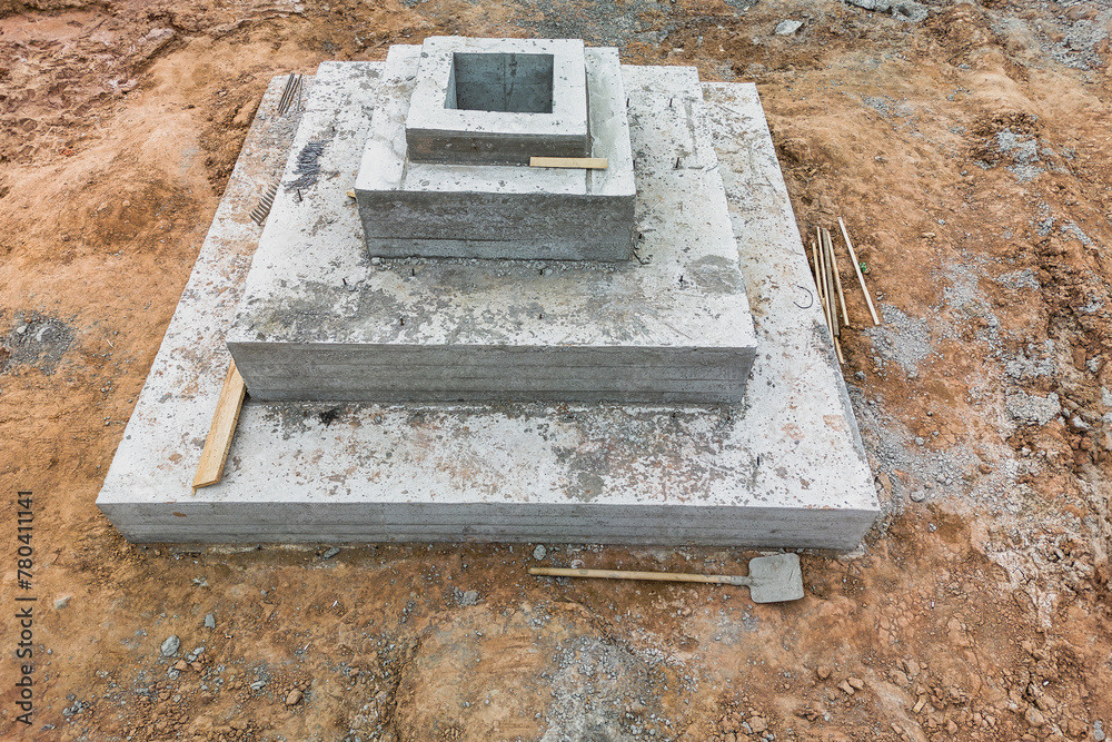Monolithic reinforced concrete foundations for the construction of a large building. Grillage at the construction site. Construction pit with foundation. close-up View from above