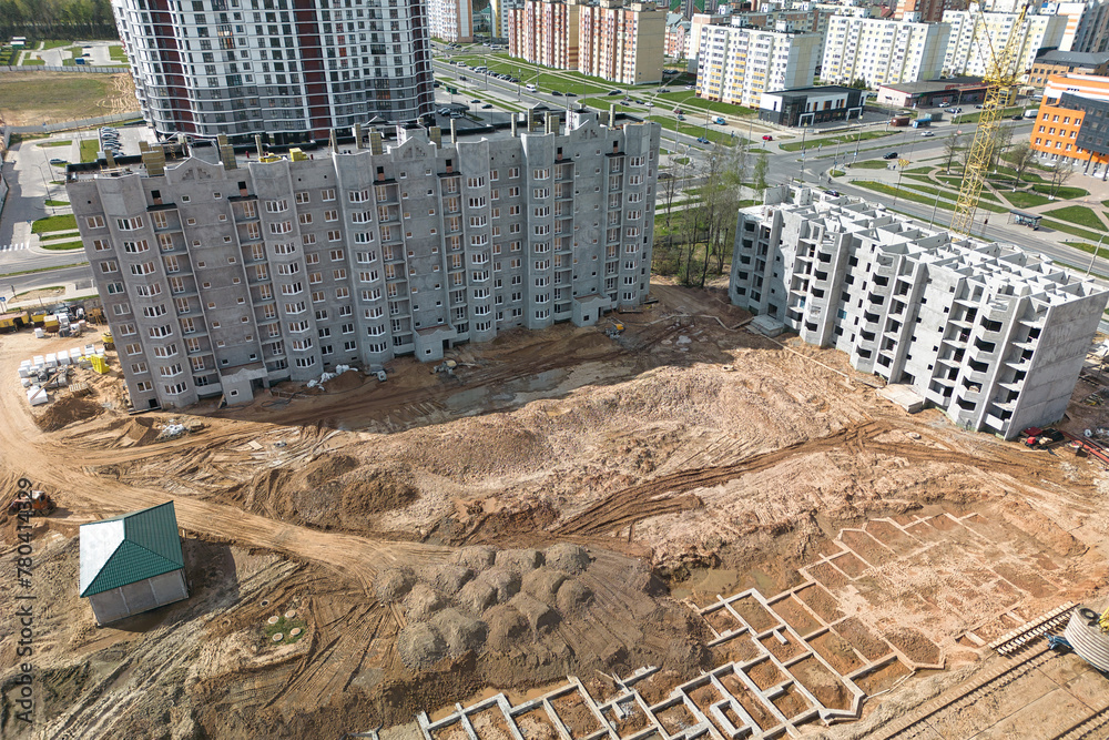 An aerial view of a bustling construction site in a city, where workers are busy erecting structures and moving heavy machinery