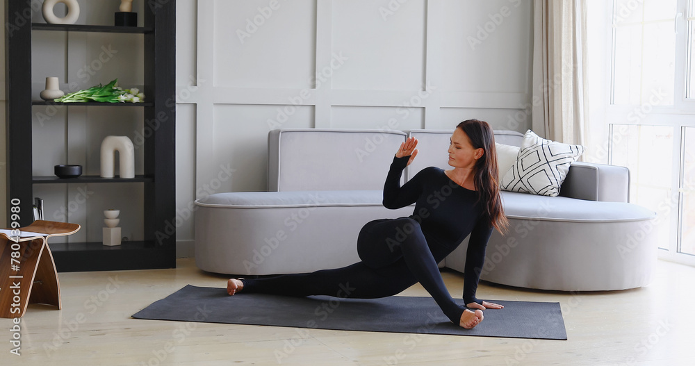 Athletic woman performs twisting in lizard pose at home, Uttana Prishthasana, training in black sports overalls on the mat, healthy lifestyle concept