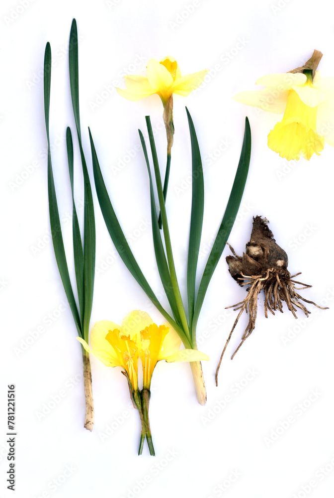 Herbarium. The narcissus flower is yellow in color, its stem, leaves, inflorescence and root system are in the form of a bulb.