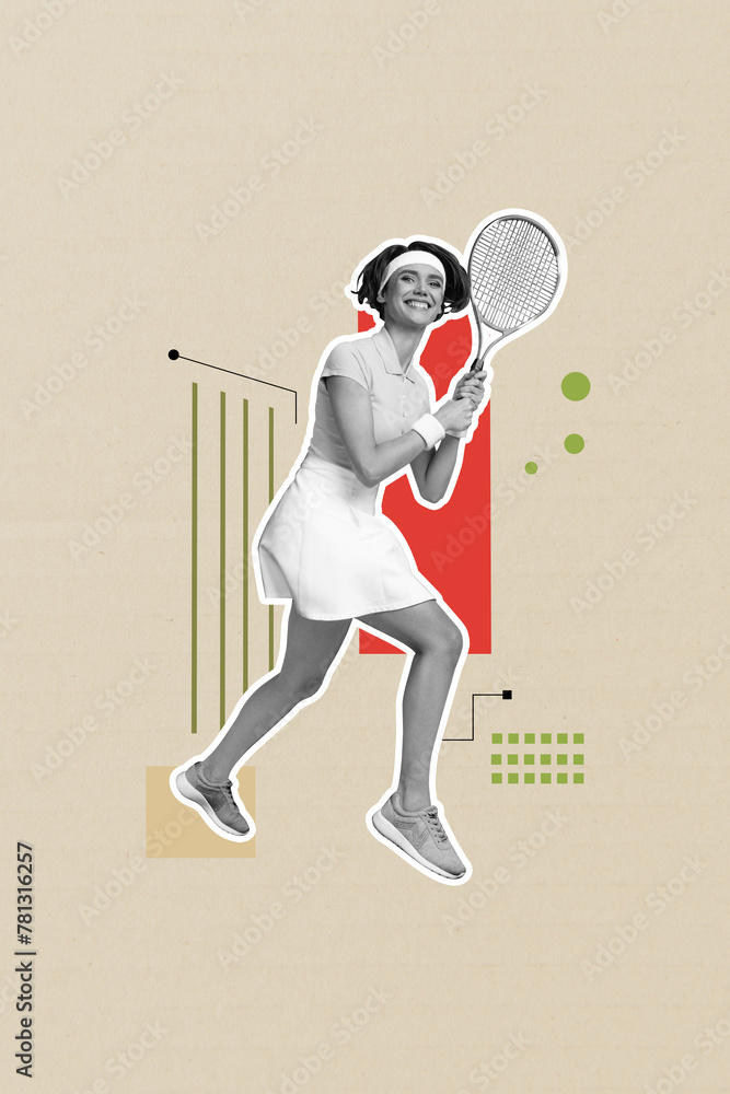 Vertical image collage of happy girl hold racket big tennis game championship sportswoman player league isolated on colorful background
