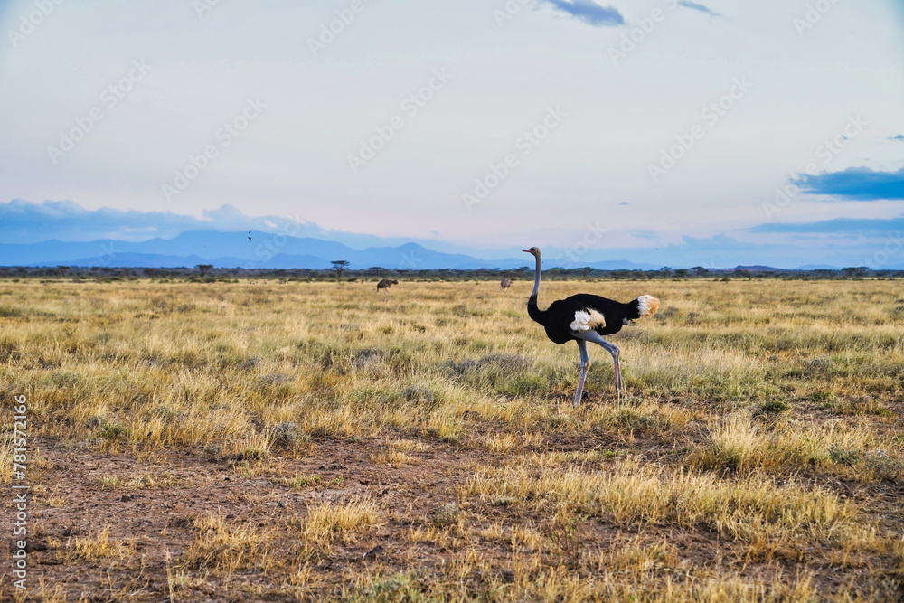 A beautiful scene of a lone endangered Somali male Ostrich moving through the samburu grasslands in the late evening at the Buffalo Springs Reserve in Samburu County, Kenya