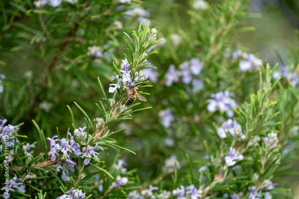 Close Up of a bee collecting honey from a rosemary bush