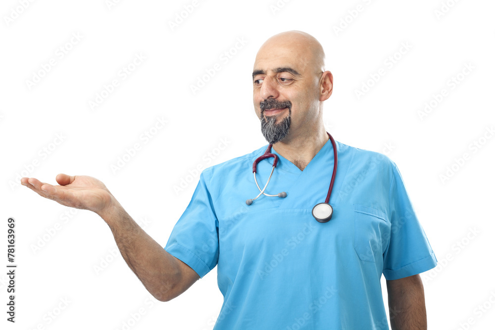 Doctor presenting a product isolated on white