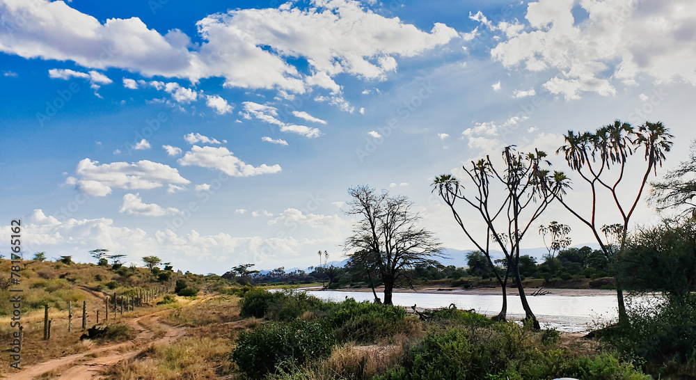 Doum palms line the shores of the Ewaso Ngiro river, the lifeline of the vast Samburu reserve at the Buffalo Springs Reserve in Samburu County, Kenya